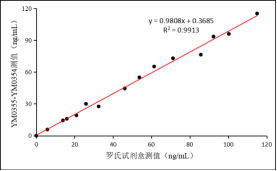 YM0355-YM0354配对抗体与罗氏试剂临床相关性比较在0-120ng/mL范围内,相关性R方为0.975。