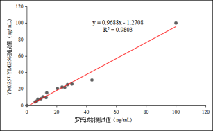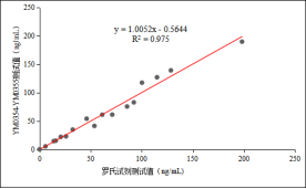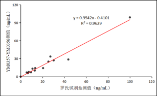 YM0357-YM0356配对抗体与罗氏试剂临床相关性比较在0-100ng/mL范围内,相关性R方为0.9629。