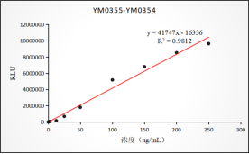 YM0357-YM0356配对抗体与罗氏试剂临床相关性比较在0-100ng/mL范围内,相关性R方为0.9803。